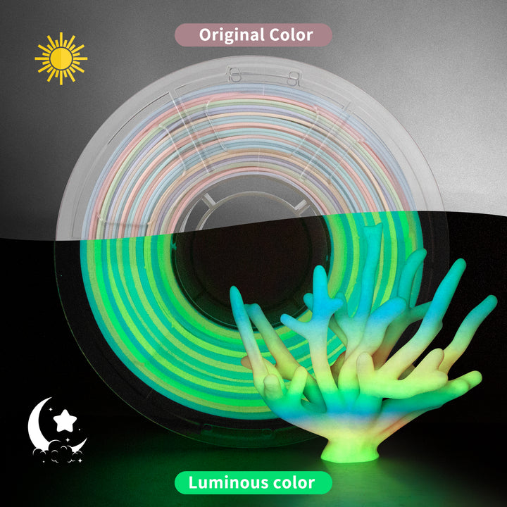 đăDazzling Glow, Shines Day and NightăiSANMATE glow-in-the-dark rainbow color PLA filament. It displays a stunning rainbow gradient under daylight, making your prints beautiful even before it gets dark. After absorbing sufficient light, it automatically emits a soft and long-lasting glow in the dark, requiring no power. This creates amazing visual magic, ensuring your creations stand out brilliantly both day and night