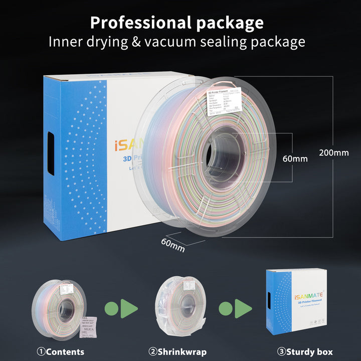 đăVacuum sealed packagingăiSANMATE 3d filament is carefully vacuum packed with desiccant to maintain the performance of PLA filament. And keep it dry to prevent dust and foreign matter from entering to prevent nozzle clogging